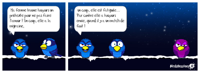 Case 1:Bird 1: Ma femme trouve toujours un prétexte pour ne pas faire l'amour ! Un coup, elle a la migraine, | Case 2: Bird 1: un coup, elle est fatiguée... Par contre elle a toujours envie, quand il y a un match de foot ! | Case 3: