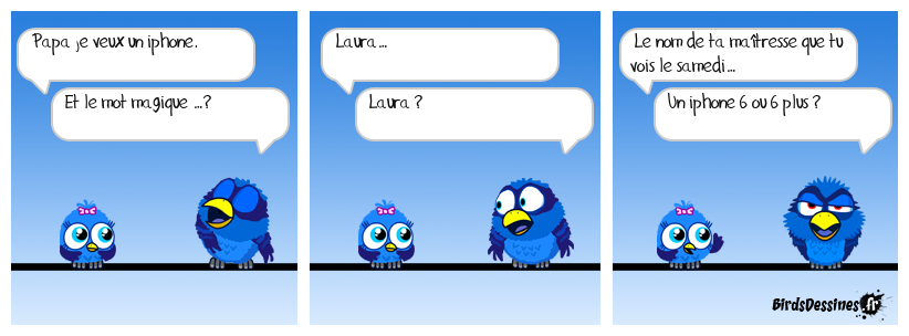 Case 1:Bird 1: Papa je veux un iphone.Bird 2: Et le mot magique …? | Case 2: Bird 1: Laura… Bird 2: Laura ? | Case 3: Bird 1: Le nom de ta maïtresse que tu vois le samedi… Bird 2: Un iphone 6 ou 6 plus ?