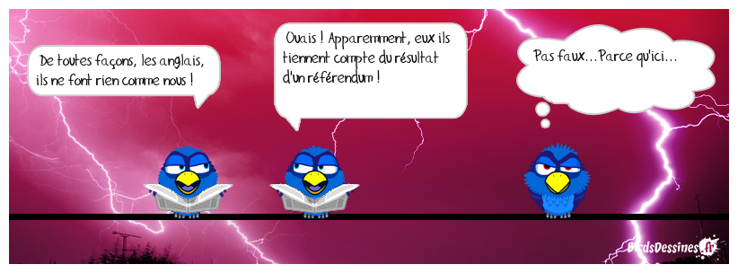 Case 1:Bird 1: De toutes façons, les anglais, ils ne font rien comme nous ! | Case 2: Bird 1: Ouais ! Apparemment, eux ils tiennent compte du résultat d'un référendum ! | Case 3: Bird 1: Pas faux...Parce qu'ici...
