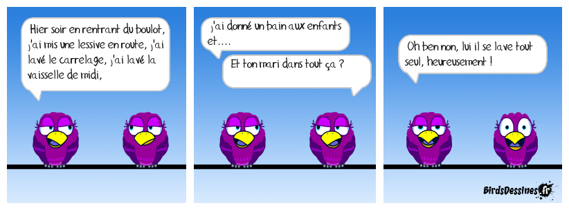 Case 1:Bird 1: Hier soir en rentrant du boulot, j'ai mis une lessive en route, j'ai lavé le carrelage, j'ai lavé la vaisselle de midi, | Case 2: Bird 1: j'ai donné un bain aux enfants et.... Bird 2: Et ton mari dans tout ça ? | Case 3: Bird 1: Oh ben non, lui il se lave tout seul, heureusement !