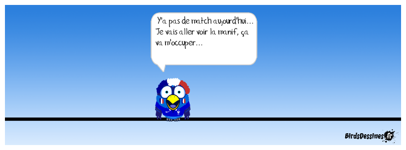 Case 1: | Case 2: Bird 1: Y'a pas de match aujourd'hui... Je vais aller voir la manif, ça va m'occuper... | Case 3: