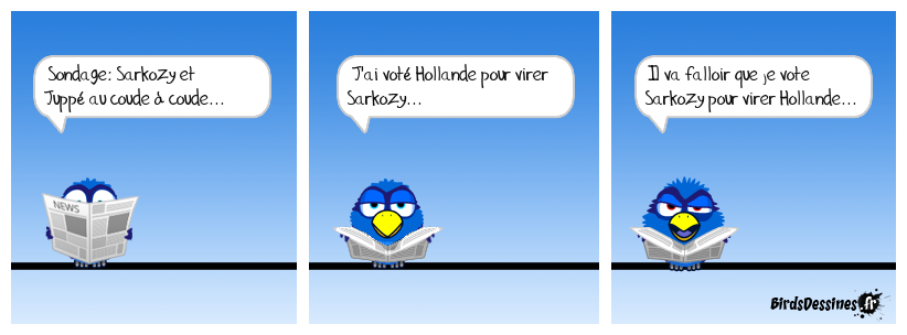 Case 1:Bird 1: Sondage: Sarkozy et Juppé au coude à coude... | Case 2: Bird 1: J'ai voté Hollande pour virer Sarkozy... | Case 3: Bird 1: Il va falloir que je vote Sarkozy pour virer Hollande...