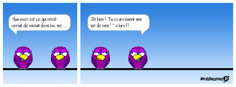 Case 1:Bird 1: Mon mari est ce qui m'est arrivé de mieux dans ma vie .. | Case 2: Bird 1: Eh ben ! Tu as vraiment une vie de mer** alors !! | Case 3: