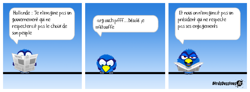 Case 1:Bird 1: Hollande : Je n'imagine pas un gouvernement qui ne respecterait pas le choix de son peuple | Case 2: Bird 1: arg ouch pfff...Désolé je m'étouffe | Case 3: Bird 1: Et nous on n'imaginait pas un président qui ne respecte pas ses engagements