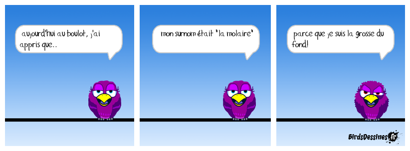 Case 1:Bird 1: aujourd'hui au boulot, j'ai appris que.. | Case 2: Bird 1: mon surnom était "la molaire" | Case 3: Bird 1: parce que je suis la grosse du fond!