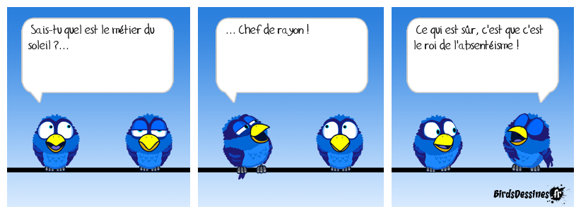 Case 1:Bird 1: Sais-tu quel est le métier du soleil ?... | Case 2: Bird 1: ... Chef de rayon ! | Case 3: Bird 1: Ce qui est sûr, c'est que c'est le roi de l'absentéisme !