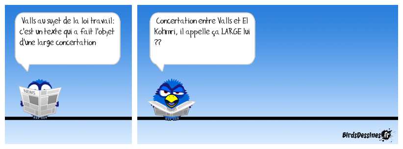 Case 1:Bird 1: Valls au sujet de la loi travail: c'est un texte qui a fait l'objet d'une large concertation | Case 2: Bird 1: Concertation entre Valls et El Kohmri, il appelle ça LARGE lui ?? | Case 3: