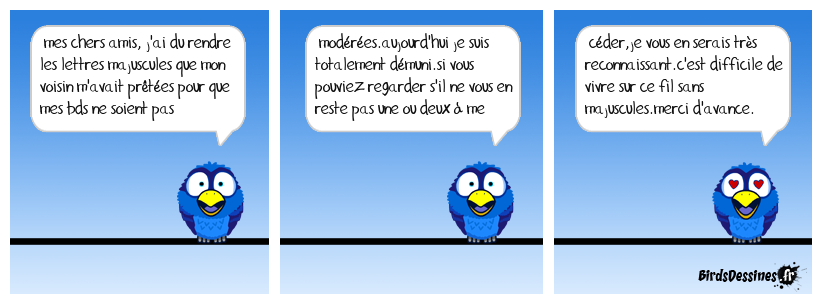 Case 1:Bird 1: mes chers amis, j'ai du rendre les lettres majuscules que mon voisin m'avait prêtées pour que mes bds ne soient pas | Case 2: Bird 1: modérées.aujourd'hui je suis totalement démuni.si vous pouviez regarder s'il ne vous en reste pas une ou deux à me | Case 3: Bird 1: céder,je vous en serais très reconnaissant.c'est difficile de vivre sur ce fil sans majuscules.merci d'avance.