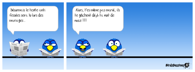 Case 1:Bird 1: Désormais le texte anti fessées sera lu lors des mariages . | Case 2: Bird 1: Alors, t'es même pas marié, ils te gâchent déjà ta nuit de noce !!! | Case 3: