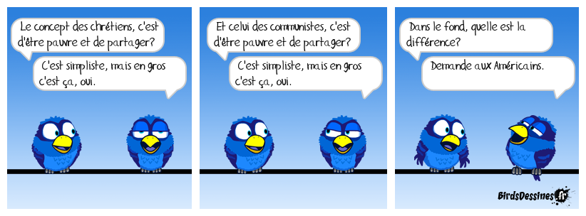 Case 1:Bird 1: Le concept des chrétiens, c'est d'être pauvre et de partager?Bird 2: C'est simpliste, mais en gros c'est ça, oui. | Case 2: Bird 1: Et celui des communistes, c'est d'être pauvre et de partager? Bird 2: C'est simpliste, mais en gros c'est ça, oui. | Case 3: Bird 1: Dans le fond, quelle est la différence? Bird 2: Demande aux Américains.