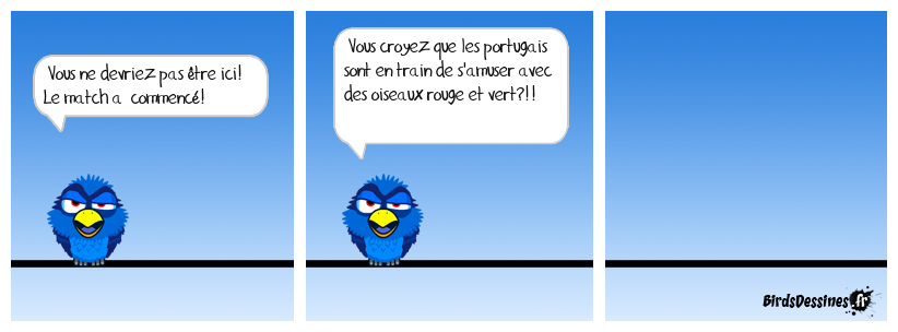 Case 1:Bird 1: Vous ne devriez pas être ici! Le match a commencé! | Case 2: Bird 1: Vous croyez que les portugais sont en train de s'amuser avec des oiseaux rouge et vert?!! | Case 3: