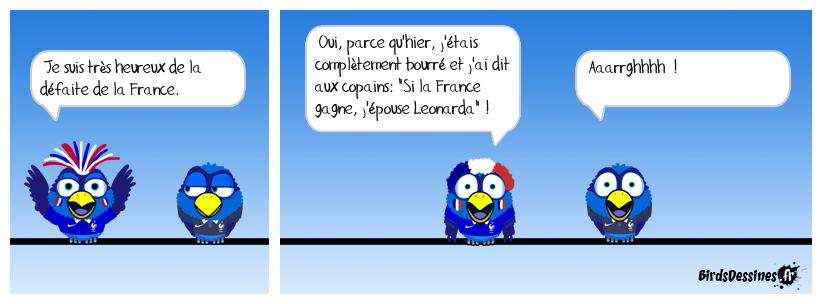Case 1:Bird 1: Je suis très heureux de la défaite de la France. | Case 2: Bird 1: Oui, parce qu'hier, j'étais complètement bourré et j'ai dit aux copains: "Si la France gagne, j'épouse Leonarda" ! | Case 3: Bird 1: Aaarrghhhh !