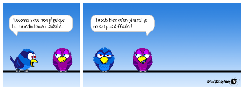 Case 1:Bird 1: Reconnais que mon physique t'a immédiatement séduite. | Case 2: Bird 1: Tu sais bien qu'en général je ne suis pas difficile ! | Case 3: