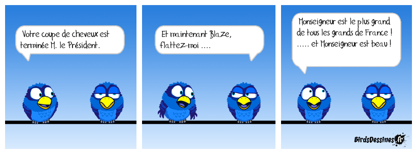 Case 1:Bird 1: Votre coupe de cheveux est terminée M. le Président. | Case 2: Bird 1: Et maintenant Blaze, flattez-moi .... | Case 3: Bird 1: Monseigneur est le plus grand de tous les grands de France ! ..... et Monseigneur est beau !