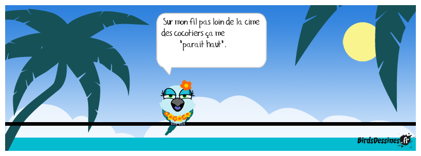 Case 1: | Case 2: Bird 1: Sur mon fil pas loin de la cime des cocotiers ça me "parait haut". | Case 3: