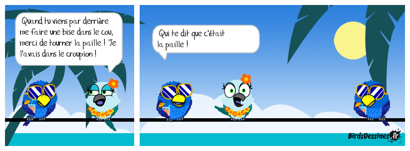 Case 1:Bird 1: Quand tu viens par derrière me faire une bise dans le cou, merci de tourner la paille ! Je l'avais dans le croupion ! | Case 2: Bird 1: Qui te dit que c'était la paille ! | Case 3: