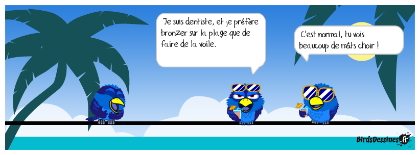 Case 1: | Case 2: Bird 1: Je suis dentiste, et je préfère bronzer sur la plage que de faire de la voile. | Case 3: Bird 1: C'est normal, tu vois beaucoup de mâts choir !