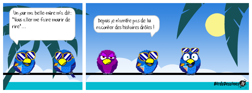 Case 1:Bird 1: Un jour ma belle-mère m'a dit: "Vous aller me faire mourir de rire"... | Case 2: Bird 1: Depuis je n'arrête pas de lui raconter des histoires drôles ! | Case 3:
