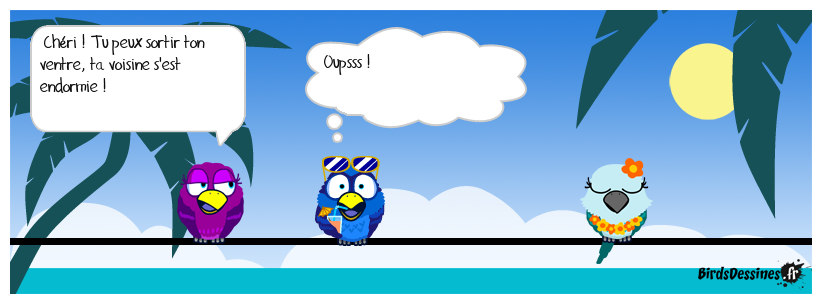 Case 1:Bird 1: Chéri ! Tu peux sortir ton ventre, ta voisine s'est endormie ! | Case 2: Bird 1: Oupsss ! | Case 3: