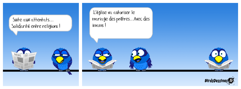 Case 1:Bird 1: Suite aux attentats... Solidarité entre religions ! | Case 2: Bird 1: L'église va autoriser le mariage des prêtres...Avec des imams ! | Case 3: