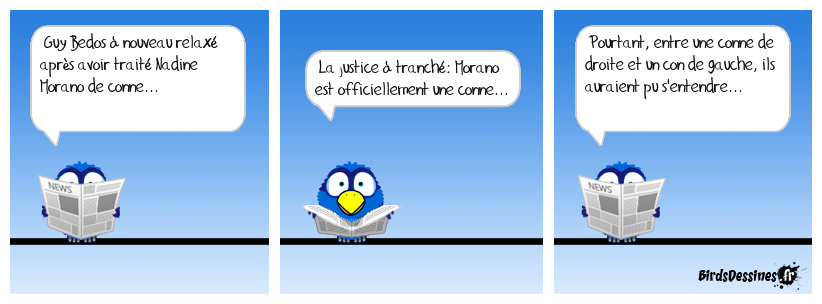 Case 1:Bird 1: Guy Bedos à nouveau relaxé après avoir traité Nadine Morano de conne... | Case 2: Bird 1: La justice à tranché: Morano est officiellement une conne... | Case 3: Bird 1: Pourtant, entre une conne de droite et un con de gauche, ils auraient pu s'entendre...