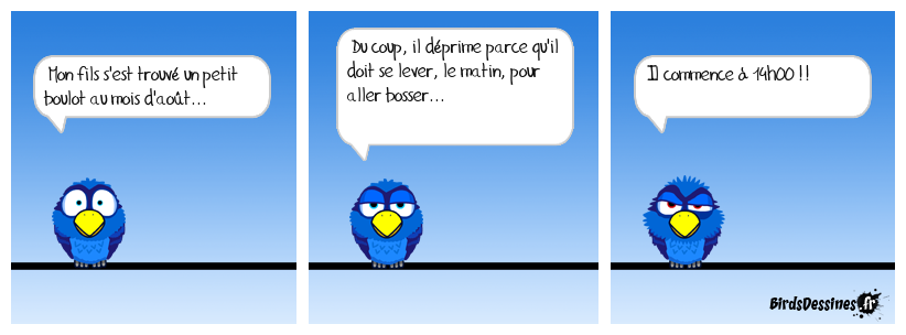 Case 1:Bird 1: Mon fils s'est trouvé un petit boulot au mois d'août... | Case 2: Bird 1: Du coup, il déprime parce qu'il doit se lever, le matin, pour aller bosser... | Case 3: Bird 1: Il commence à 14h00 !!