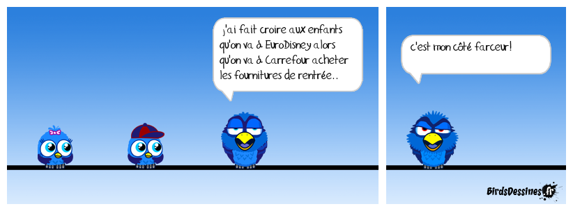 Case 1: | Case 2: Bird 1: j'ai fait croire aux enfants qu'on va à EuroDisney alors qu'on va à Carrefour acheter les fournitures de rentrée.. | Case 3: Bird 1: c'est mon côté farceur!