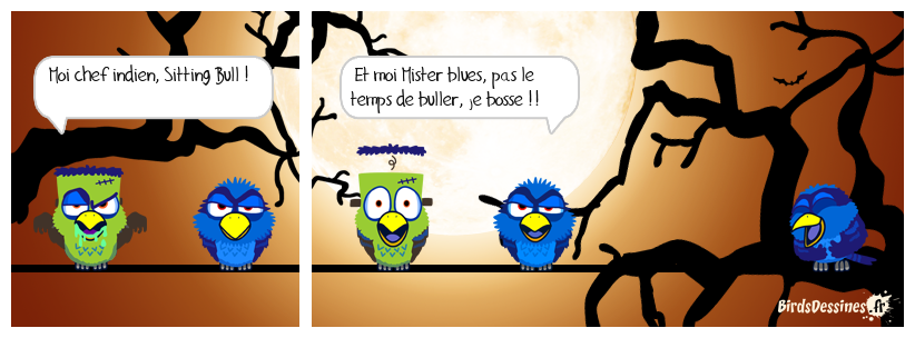 Case 1:Bird 1: Moi chef indien, Sitting Bull ! | Case 2: Bird 1: Et moi Mister blues, pas le temps de buller, je bosse !! | Case 3: