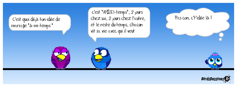 Case 1:Bird 1: C'est quoi déjà ton idée de mariage "à-mi-temps " | Case 2: Bird 1: c'est "AMI(E)-temps", 2 jours chez soi, 2 jours chez l'autre, et le reste du temps, chacun vit sa vie avec qui il veut | Case 3: Bird 1: Pas con, c't'idée là !