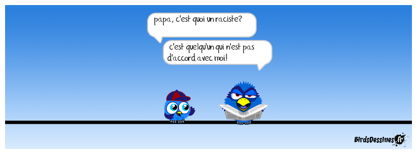 Case 1: | Case 2: Bird 1: papa, c'est quoi un raciste? Bird 2: c'est quelqu'un qui n'est pas d'accord avec moi! | Case 3: