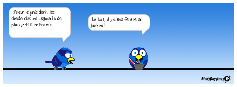 Case 1:Bird 1: M'sieur le président, les dividendes ont augmenté de plus de 11 % en France..... | Case 2: Bird 1: Là bas, il y a une femme en burkini ! | Case 3: