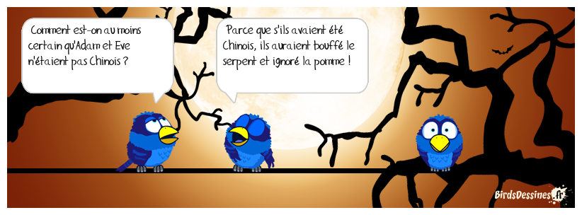 Case 1:Bird 1: Comment est-on au moins certain qu'Adam et Eve n'étaient pas Chinois ? | Case 2: Bird 1: Parce que s'ils avaient été Chinois, ils auraient bouffé le serpent et ignoré la pomme ! | Case 3:
