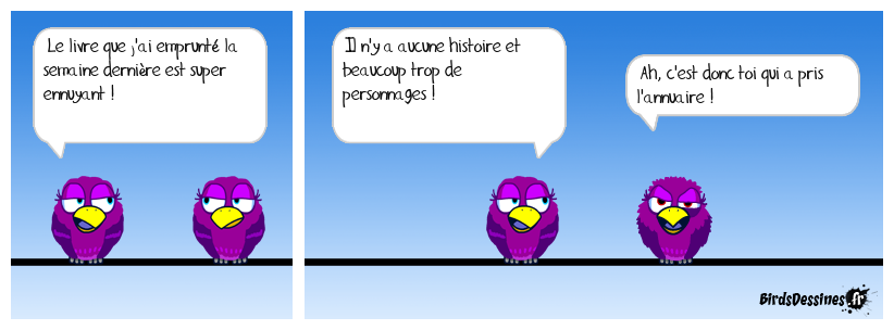 Case 1:Bird 1: Le livre que j'ai emprunté la semaine dernière est super ennuyant ! | Case 2: Bird 1: Il n'y a aucune histoire et beaucoup trop de personnages ! | Case 3: Bird 1: Ah, c'est donc toi qui a pris l'annuaire !