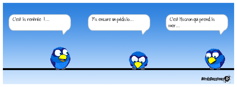 Case 1:Bird 1: C'est la rentrée !... | Case 2: Bird 1: Y'a encore un pédalo... | Case 3: Bird 1: C'est Macron qui prend la mer...