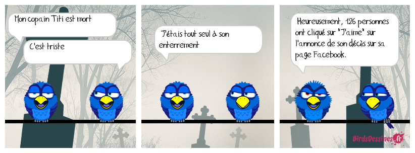 Case 1:Bird 1: Mon copain Titi est mortBird 2: C'est triste | Case 2: Bird 1: J'étais tout seul à son enterrement | Case 3: Bird 1: Heureusement, 126 personnes ont cliqué sur "J'aime" sur l'annonce de son décès sur sa page Facebook.