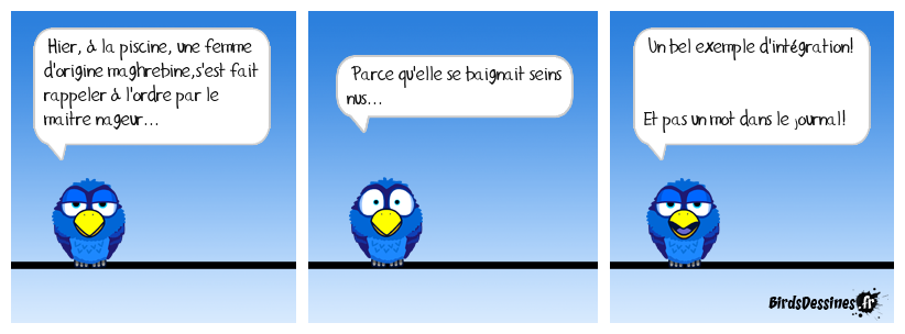 Case 1:Bird 1: Hier, à la piscine, une femme d'origine maghrebine,s'est fait rappeler à l'ordre par le maitre nageur... | Case 2: Bird 1: Parce qu'elle se baignait seins nus... | Case 3: Bird 1: Un bel exemple d'intégration! Et pas un mot dans le journal!