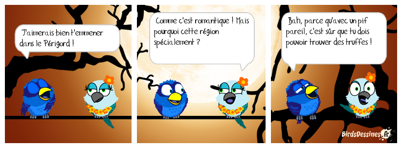 Case 1:Bird 1: J'aimerais bien t'emmener dans le Périgord ! | Case 2: Bird 1: Comme c'est romantique ! Mais pourquoi cette région spécialement ? | Case 3: Bird 1: Bah, parce qu'avec un pif pareil, c'est sûr que tu dois pouvoir trouver des truffes !