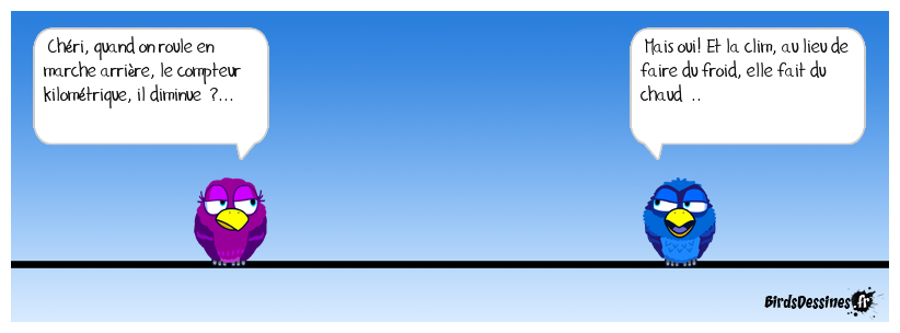 Case 1:Bird 1: Chéri, quand on roule en marche arrière, le compteur kilométrique, il diminue ?... | Case 2: | Case 3: Bird 1: Mais oui! Et la clim, au lieu de faire du froid, elle fait du chaud ..