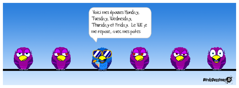 Case 1: | Case 2: Bird 1: Voici mes épouses Monday, Tuesday, Wednesday, Thursday et Friday. Le WE je me repose, avec mes potes | Case 3: