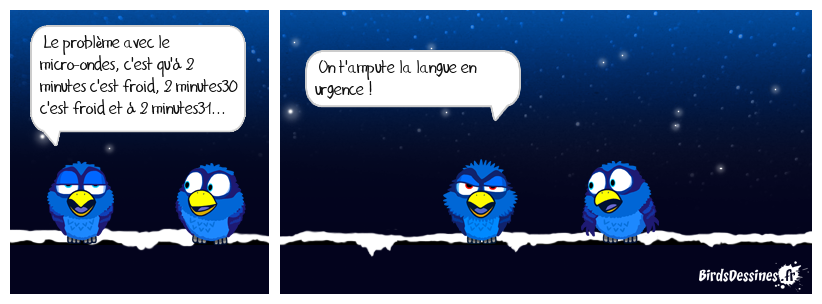Case 1:Bird 1: Le problème avec le micro-ondes, c'est qu'à 2 minutes c'est froid, 2 minutes30 c'est froid et à 2 minutes31... | Case 2: Bird 1: On t'ampute la langue en urgence ! | Case 3: