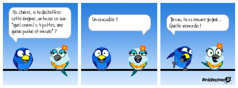 Case 1:Bird 1: Ma chérie, si tu déchiffres cette énigme, on baise ce soir. "quel animal a 4 pattes, une queue poilue et miaule" ? | Case 2: Bird 1: Un crocodile ? | Case 3: Bird 1: Bravo, tu as encore gagné... Quelle veinarde !