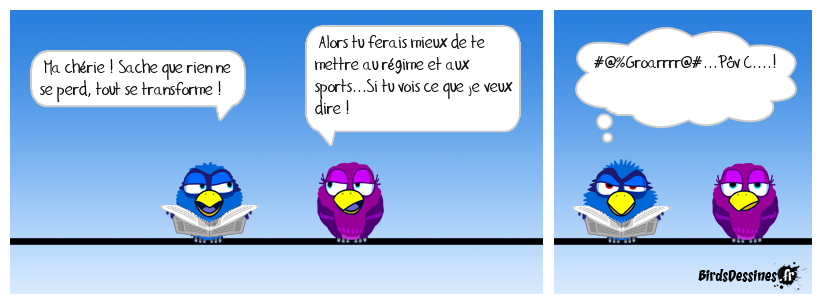 Case 1:Bird 1: Ma chérie ! Sache que rien ne se perd, tout se transforme ! | Case 2: Bird 1: Alors tu ferais mieux de te mettre au régime et aux sports...Si tu vois ce que je veux dire ! | Case 3: Bird 1: #@%Groarrrr@#...Pôv C....!