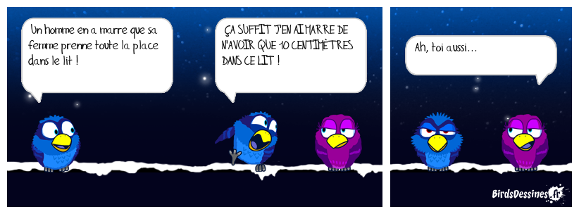 Case 1:Bird 1: Un homme en a marre que sa femme prenne toute la place dans le lit ! | Case 2: Bird 1: ÇA SUFFIT J'EN AI MARRE DE N'AVOIR QUE 10 CENTIMÉTRES DANS CE LIT ! | Case 3: Bird 1: Ah, toi aussi...