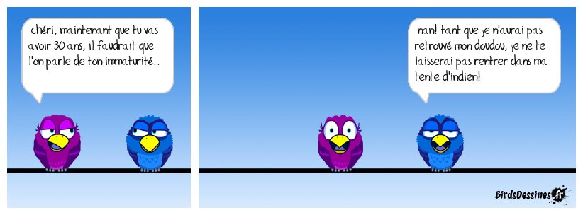 Case 1:Bird 1: chéri, maintenant que tu vas avoir 30 ans, il faudrait que l'on parle de ton immaturité.. | Case 2: | Case 3: Bird 1: nan! tant que je n'aurai pas retrouvé mon doudou, je ne te laisserai pas rentrer dans ma tente d'indien!