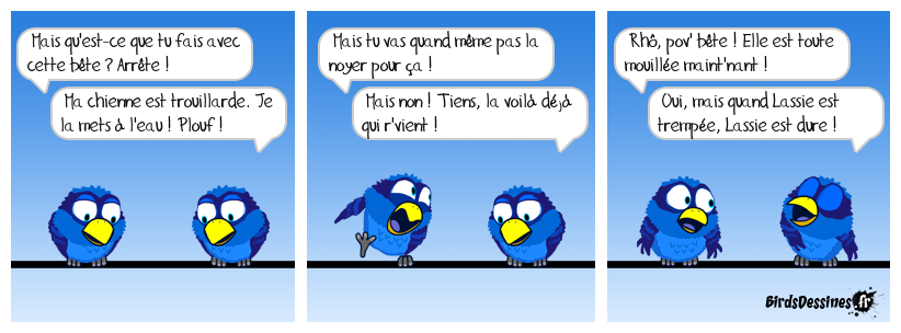 Case 1:Bird 1: Mais qu'est-ce que tu fais avec cette bête ? Arrête ! Bird 2: Ma chienne est trouillarde. Je la mets à l'eau ! Plouf ! | Case 2: Bird 1: Mais tu vas quand même pas la noyer pour ça ! Bird 2: Mais non ! Tiens, la voilà déjà qui r'vient ! | Case 3: Bird 1: Rhô, pov' bête ! Elle est toute mouillée maint'nant ! Bird 2: Oui, mais quand Lassie est trempée, Lassie est dure !