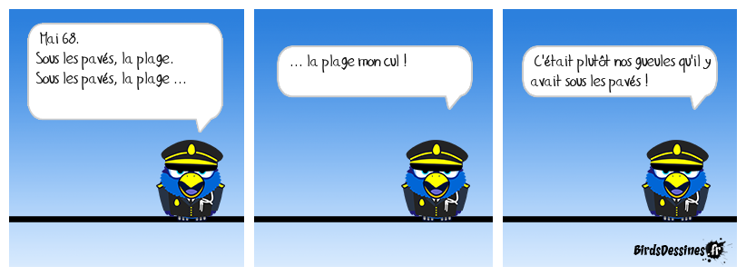 Case 1:Bird 1: Mai 68. Sous les pavés, la plage. Sous les pavés, la plage ... | Case 2: Bird 1: ... la plage mon cul ! | Case 3: Bird 1: C'était plutôt nos gueules qu'il y avait sous les pavés !
