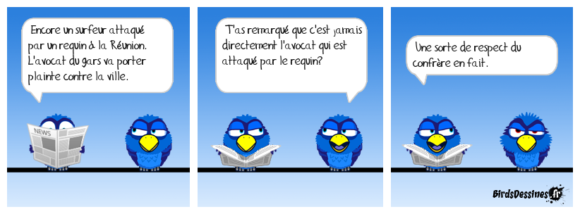 Case 1:Bird 1: Encore un surfeur attaqué par un requin à la Réunion. L'avocat du gars va porter plainte contre la ville. | Case 2: Bird 1: T'as remarqué que c'est jamais directement l'avocat qui est attaqué par le requin? | Case 3: Bird 1: Une sorte de respect du confrère en fait.
