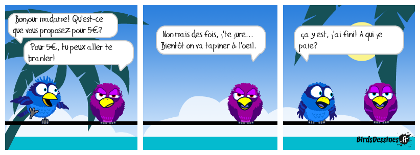 Case 1:Bird 1: Bonjour madame! Qu'est-ce que vous proposez pour 5€?Bird 2: Pour 5€, tu peux aller te branler! | Case 2: Bird 1: Non mais des fois, j'te jure... Bientôt on va tapiner à l'oeil. Bird 2: C'est ça, casse-toi... | Case 3: Bird 1: ça y est, j'ai fini! A qui je paie?