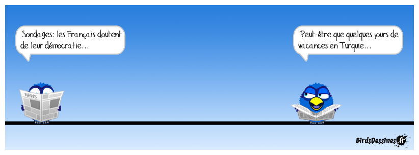 Case 1:Bird 1: Sondages: les Français doutent de leur démocratie... | Case 2: | Case 3: Bird 1: Peut-être que quelques jours de vacances en Turquie...
