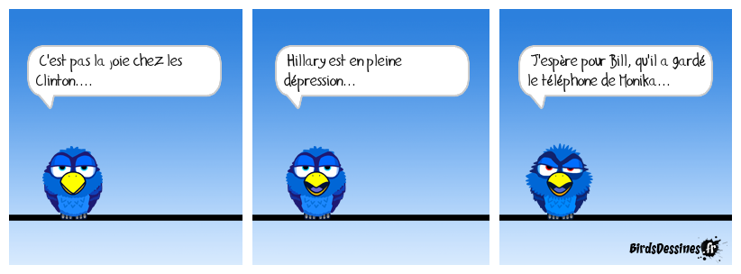 Case 1:Bird 1: C'est pas la joie chez les Clinton.... | Case 2: Bird 1: Hillary est en pleine dépression... | Case 3: Bird 1: J'espère pour Bill, qu'il a gardé le téléphone de Monika...